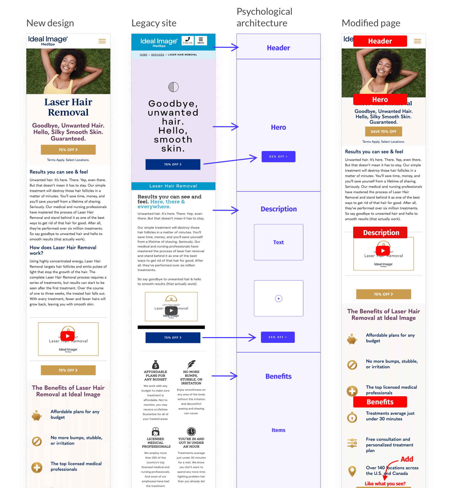 I restructured the page based on psychological architecture and users' behavior comparisons, resulting in the unprecedented success of the flagship service page (Laser Hair Removal), leading the company to finally launch the new design.